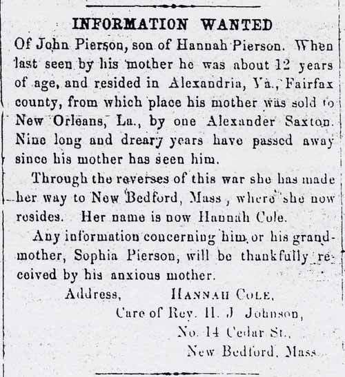 : INFORMATION WANTED Hannah Cole, Christian Recorder, 4 February 1865